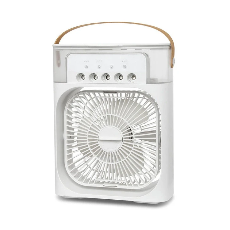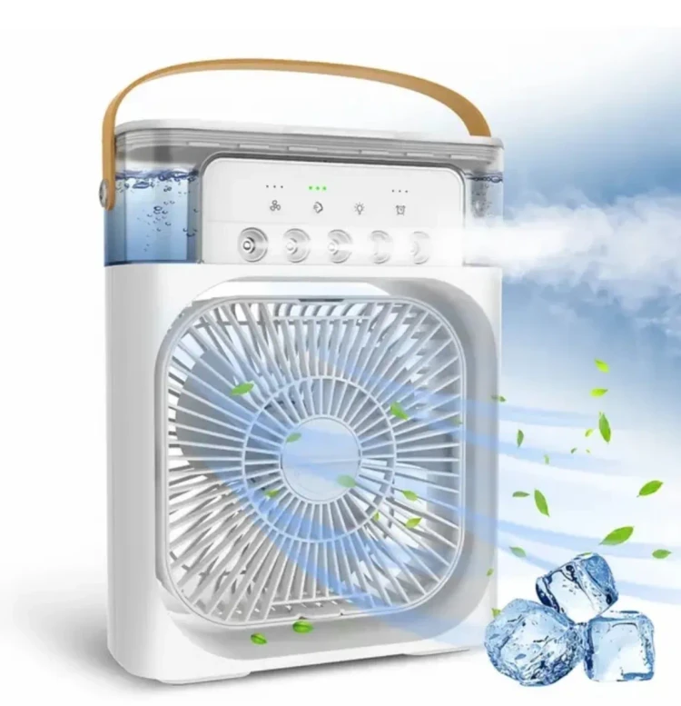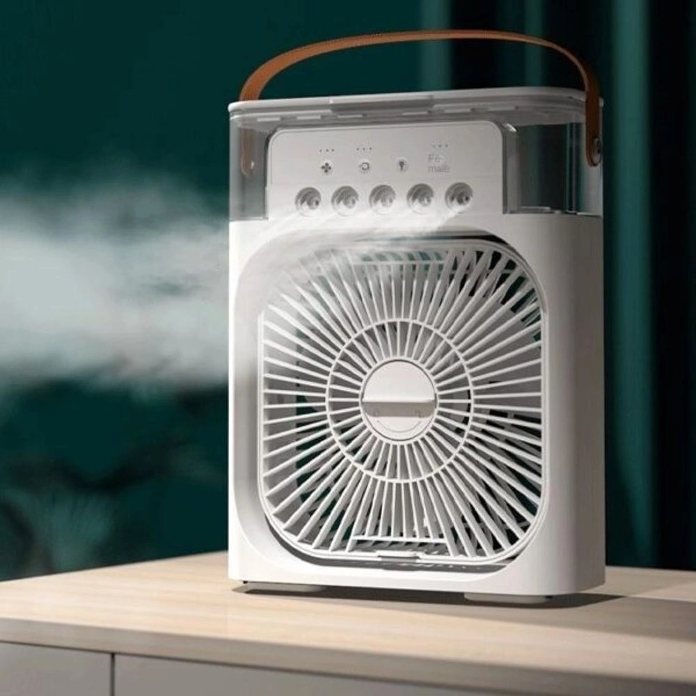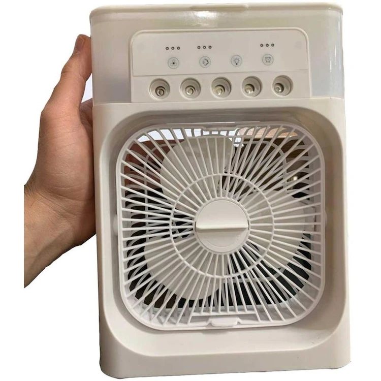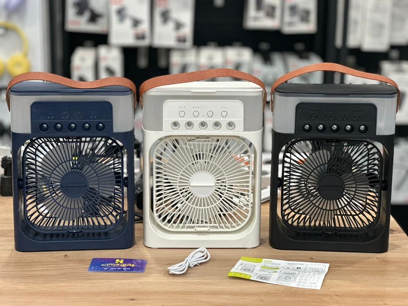 پنکه مه پاش رومیزی مدل Air Cooler Fan فاقد باتری است و به صورت مستقیم توسط آداپتور و کابل USB Type C به برق متصل میشود. دارای پنج نازل مه پاش قوی و قابلیت تنظیم تعداد مه پاش ها است. دارای تایمر جهت خاموشی خودکار می باشد. فن دستگاه قابلیت تنظیم دستی و چرخش