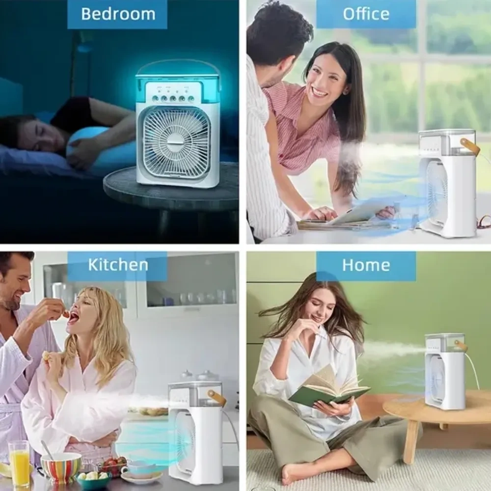 پنکه مه پاش رومیزی مدل Air Cooler Fan فاقد باتری است و به صورت مستقیم توسط آداپتور و کابل USB Type C به برق متصل میشود. دارای پنج نازل مه پاش قوی و قابلیت تنظیم تعداد مه پاش ها است. دارای تایمر جهت خاموشی خودکار می باشد. فن دستگاه قابلیت تنظیم دستی و چرخش ۳۶۰ درجه در یک جهت را دارد و محافظ فن دارای قابلیت باز و بسته شدن جهت نظافت پره ها میباشد. ترجیحا از آب تصفیه شده درون دستگاه استفاده شود جهت جلوگیری از رسوب.